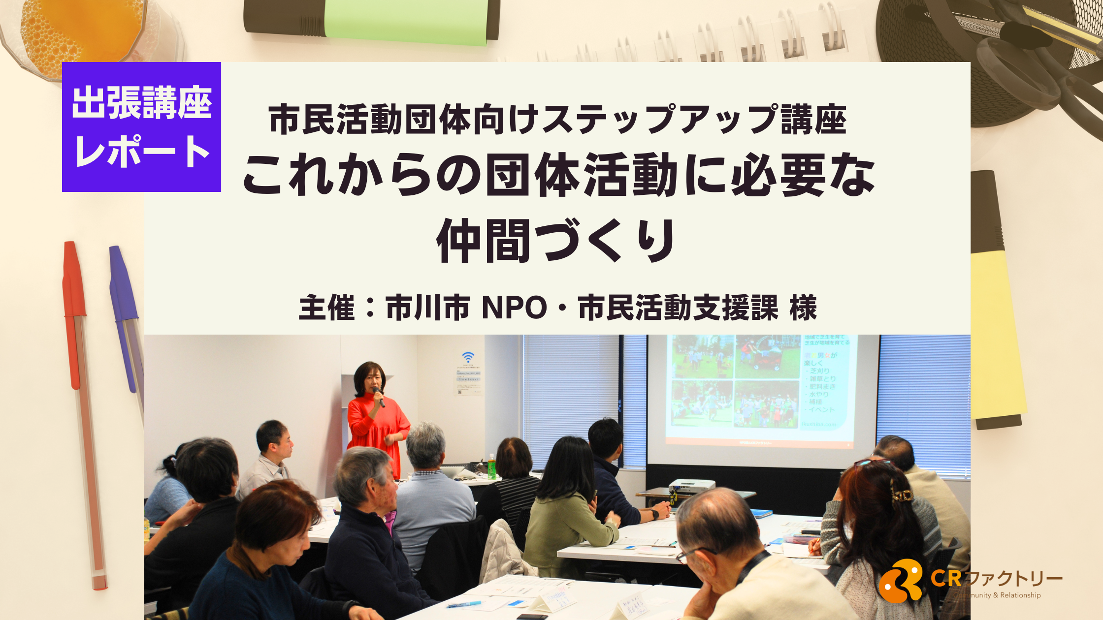 CRファクトリーは、全国各地の行政・中間支援組織と協働・連携した事業を積極的に行っています。特に、地域のコミュニティ・市民活動の組織運営支援を通して、いきいきと継続的に運営する団体を増やすことで、つながりや信頼関係(ソーシャルキャピタル)が豊かな地域づくりに取り組んでいます。