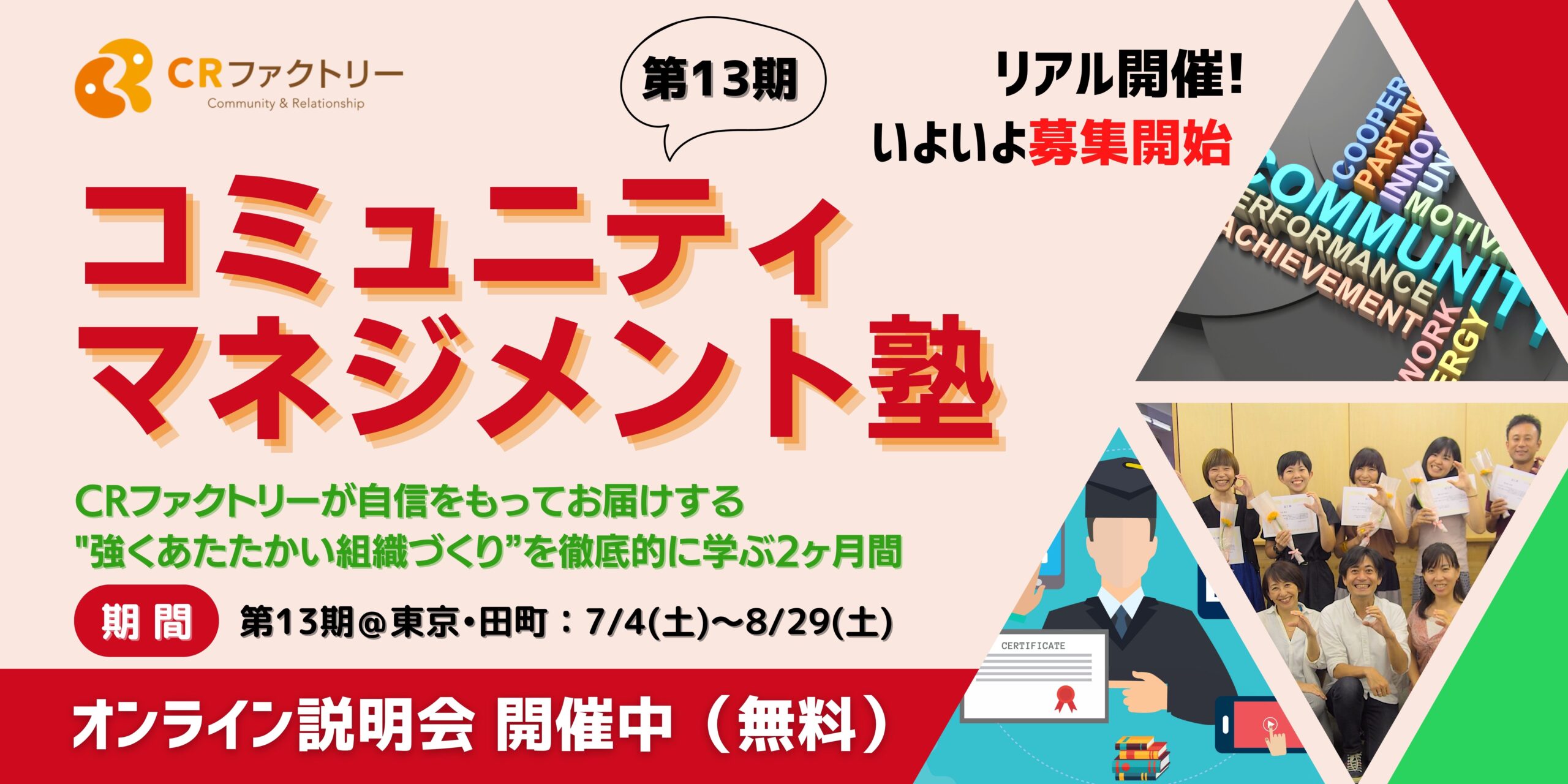 【オンライン説明会用案内ページ(参加無料)】”強くあたたかい組織づくり”を徹底的に学べる「コミュニティマネジメント塾(第13期@東京・田町)」